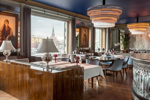 With grand chandeliers and vibrant paintings, Beluga's dining room serves Russian specialties and stunning city views.